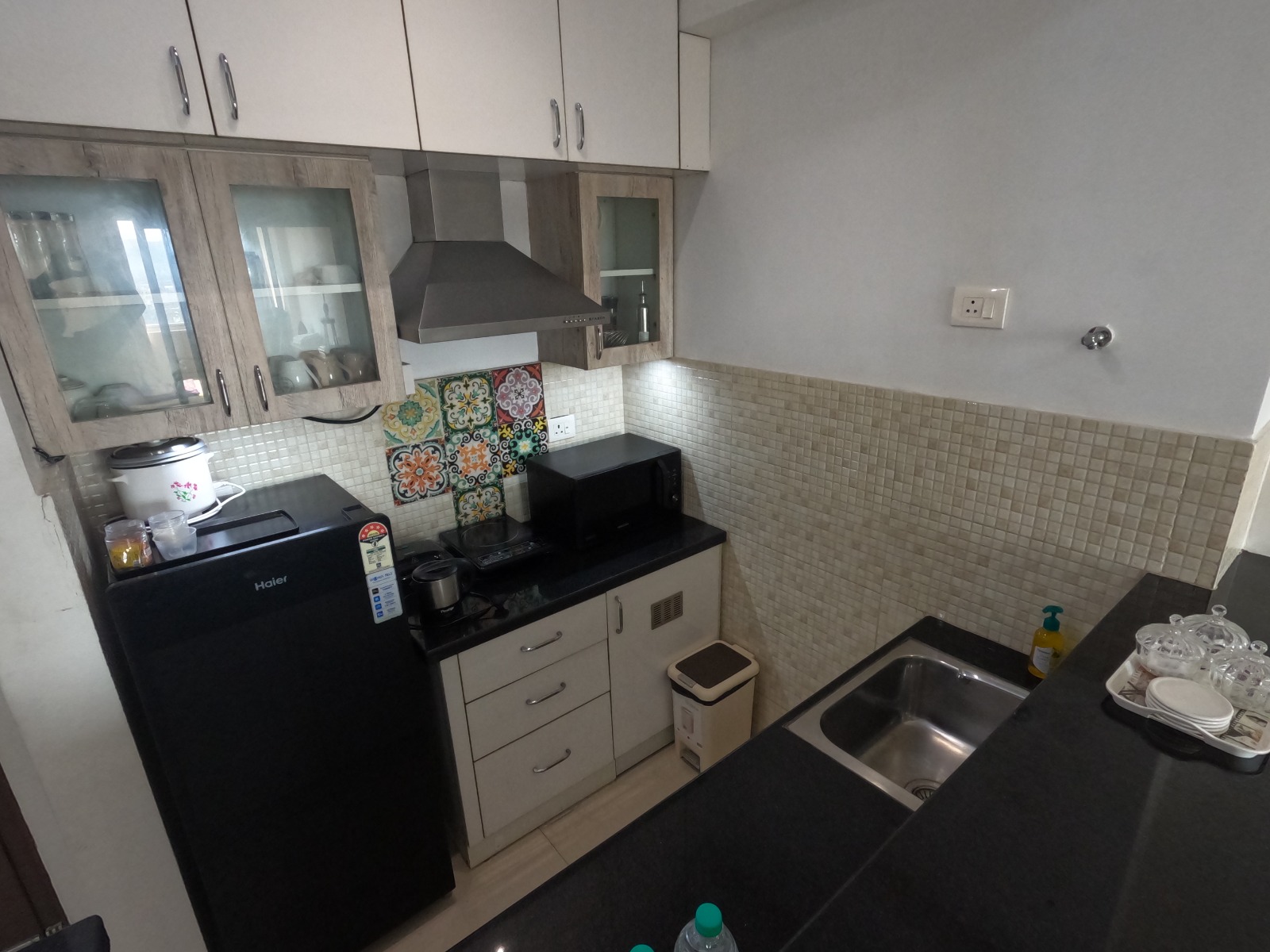 Induction stove. Microwave. Refrigerator. Coffee maker. Morning routine and simple meals covered.